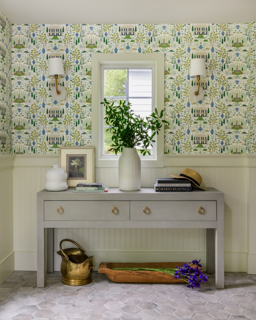 Custom Carpet Selection, Custom floor plan rendering, Custom Wainscoting, entryway design, foyer decor, Foyer Design, fringe, Furniture, Lighting, Material Selection, Paint selection, WallpaperAn Unforgettable Entryway.