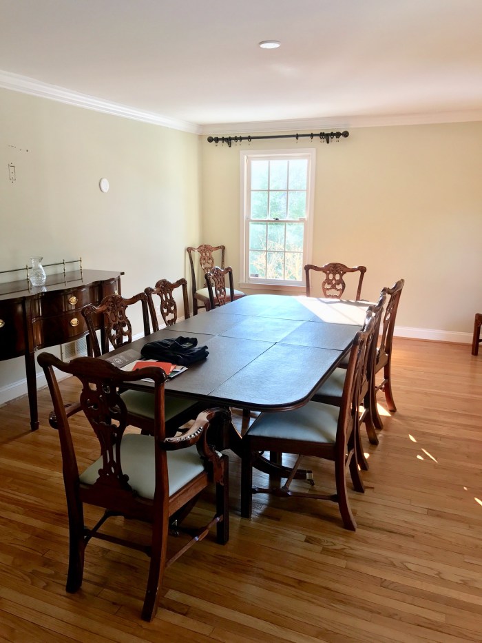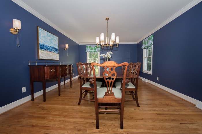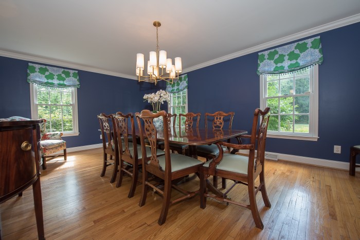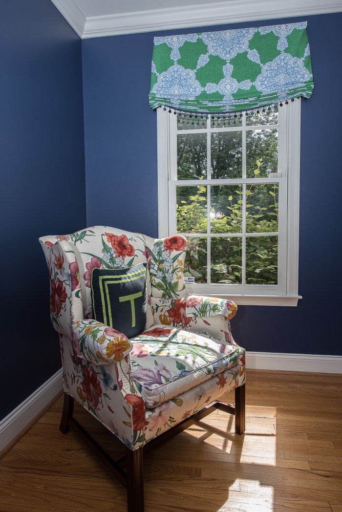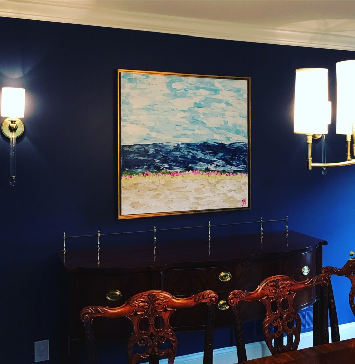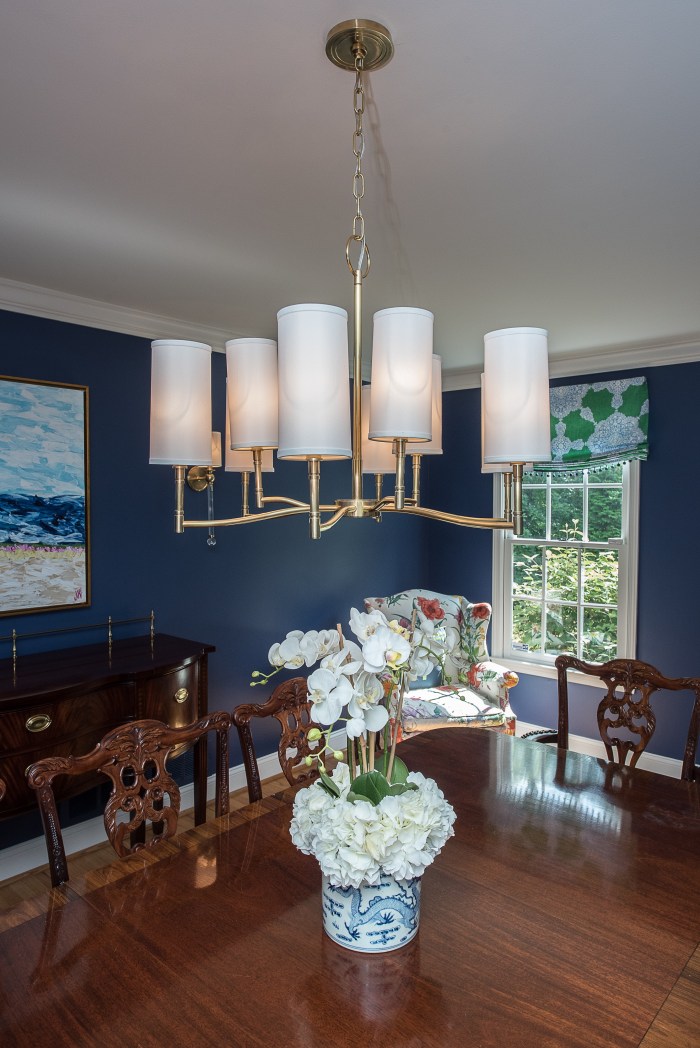 This room got a major refresh when my client said “YES” to painting the walls a deep blue. Farrow and Ball’s, Drawing Room Blue, added the right amount of drama to make this young family’s dining room ready for entertaining. Lucite sconces over the buffet and a sleeker chandelier modernized the traditional dining room table and chairs. The Roman shades, as well as the painting done by local artist, Jeannie Wolfington, were the pieces that tied it all together and gave this room a new life. The final touch will be a custom carpet to add a little softness to this beautiful room.