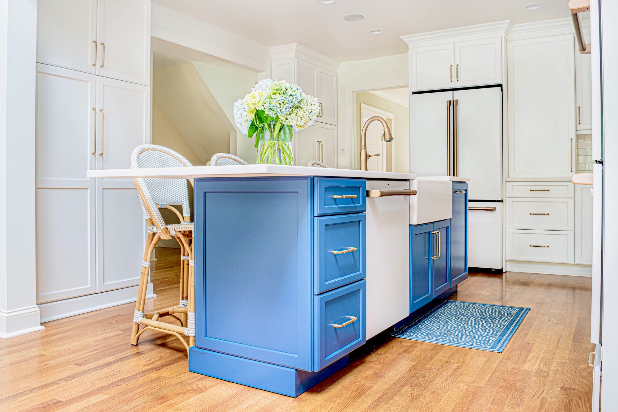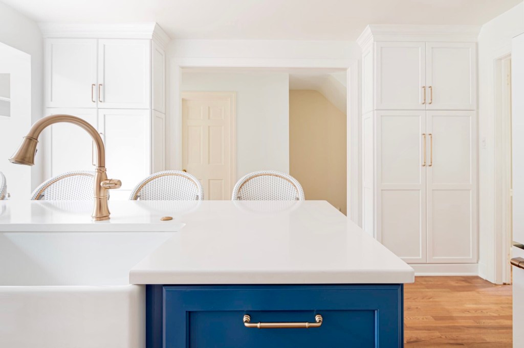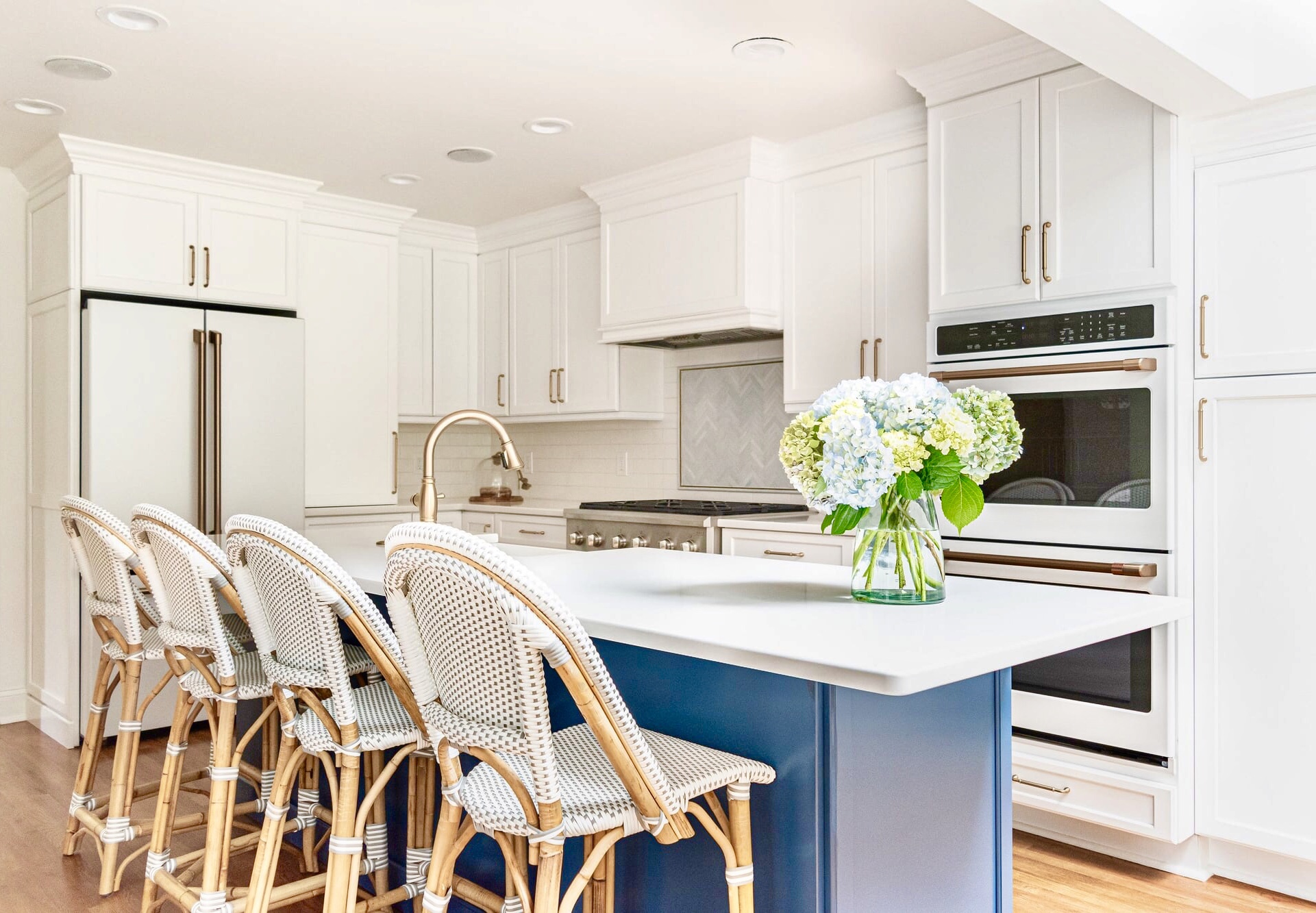 Once the floor plan and cabinet design with Glenbrook Cabinetry were ironed out, we set out to look for the necessities like appliances, hardware, and backsplash. The GE cafe in white with sleek hardware options was a great way to modernize this new kitchen. White quartz countertops and white wall cabinets were offset by a beautiful blue island as well as brass accents throughout.