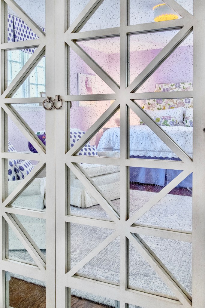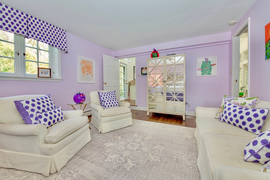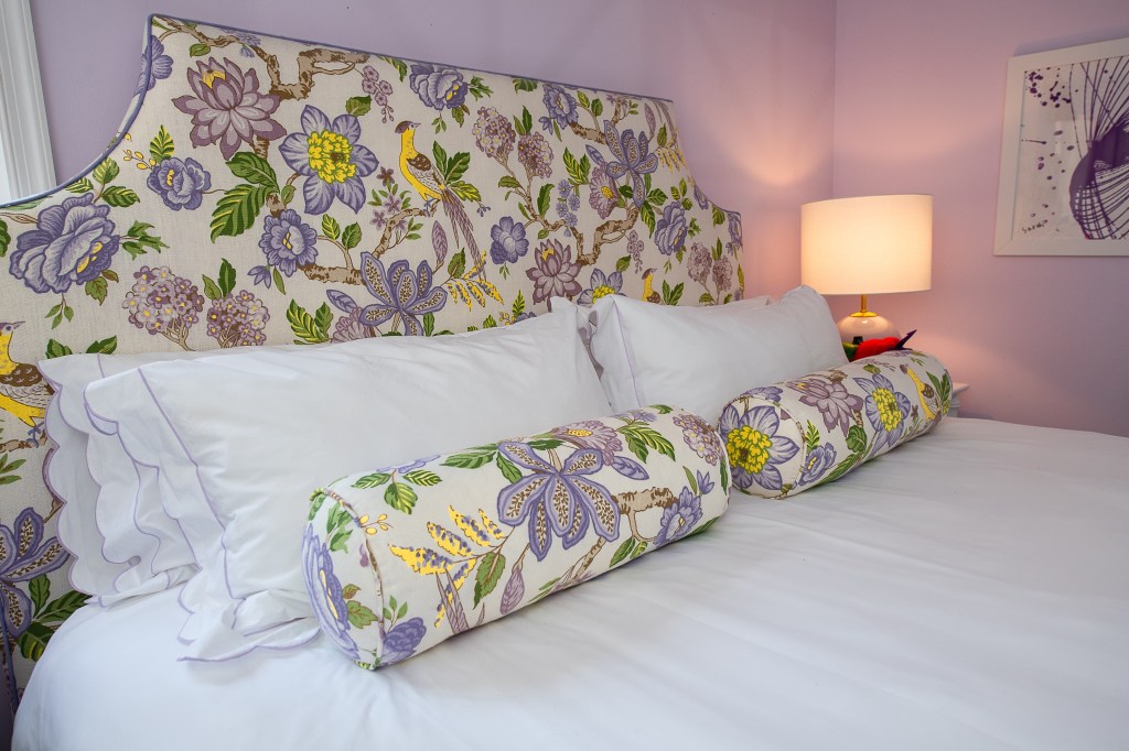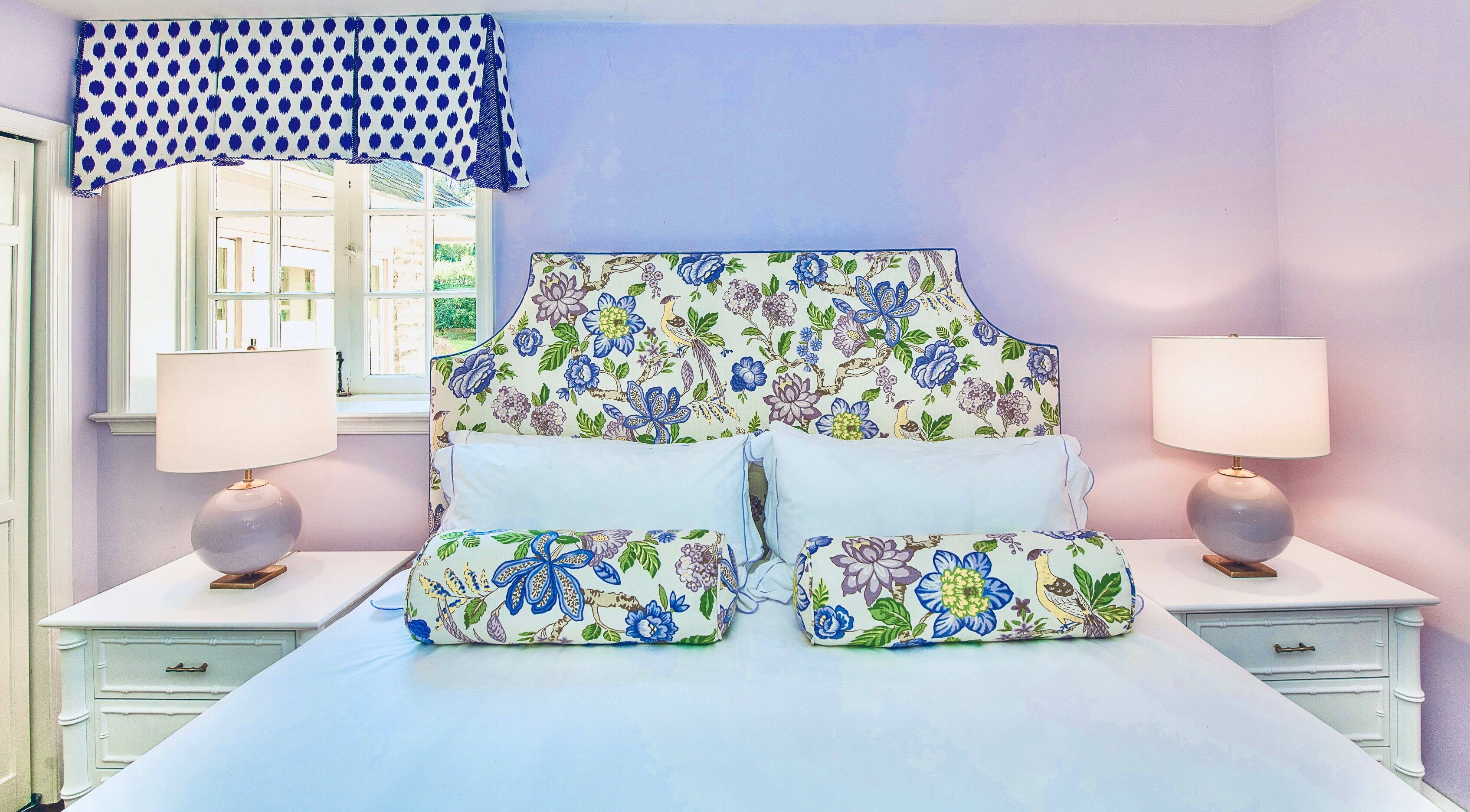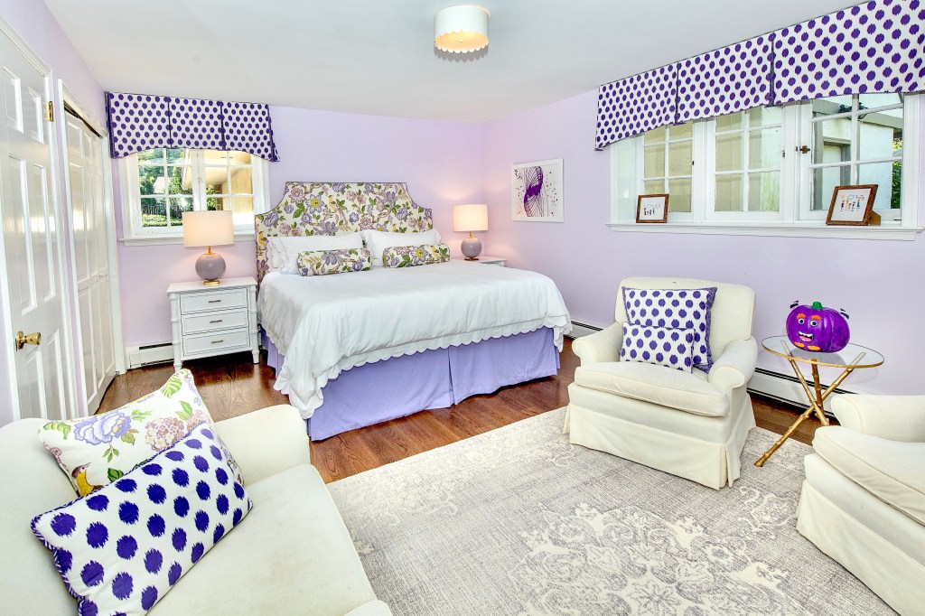 The Schumacher fabric is a great complement to the purple polka dot valences that are to remain in the room. A custom headboard, embroidered bedding, and bedskirt give this room a little sophistication and make it feel more like a guestroom.