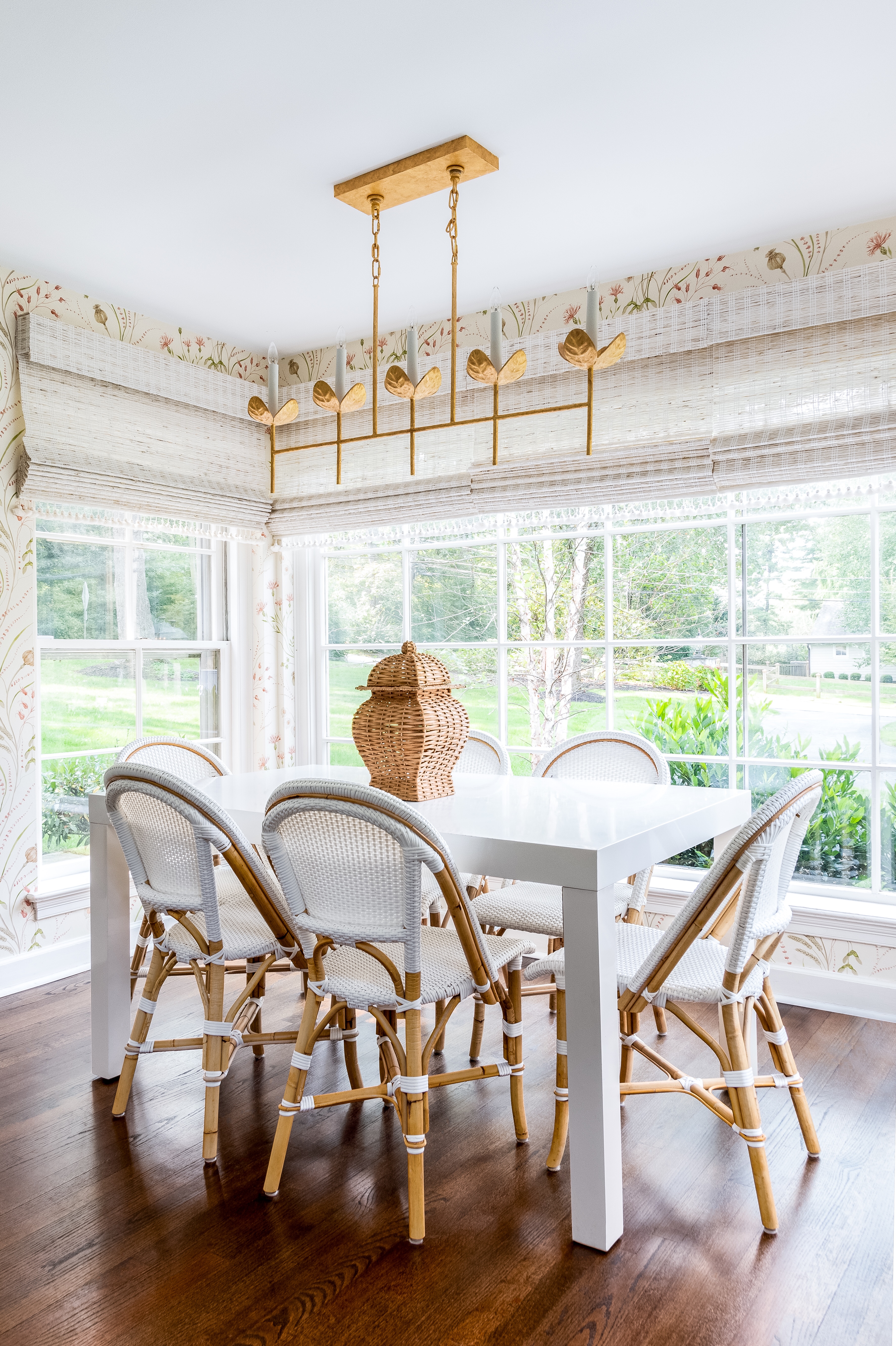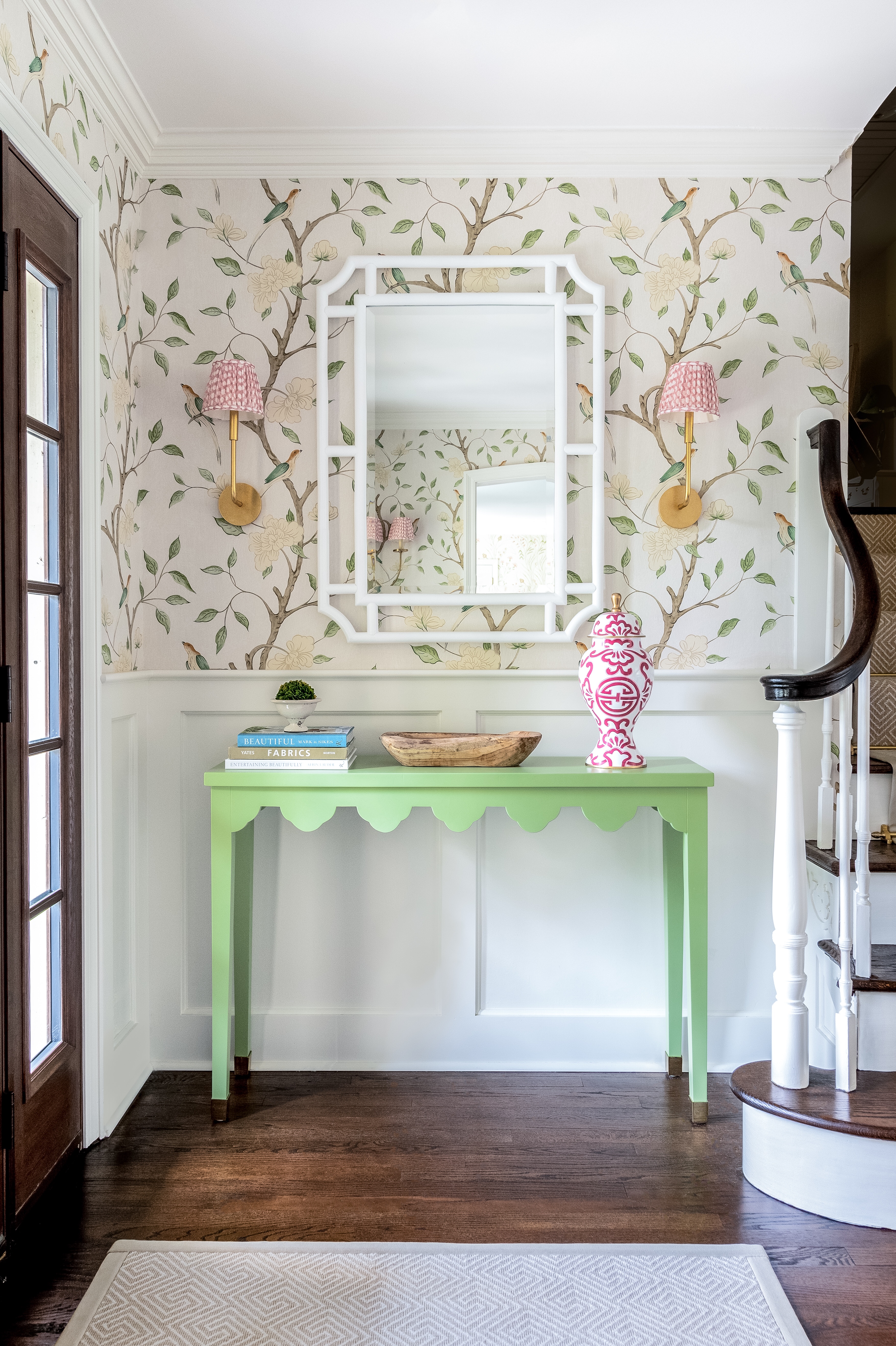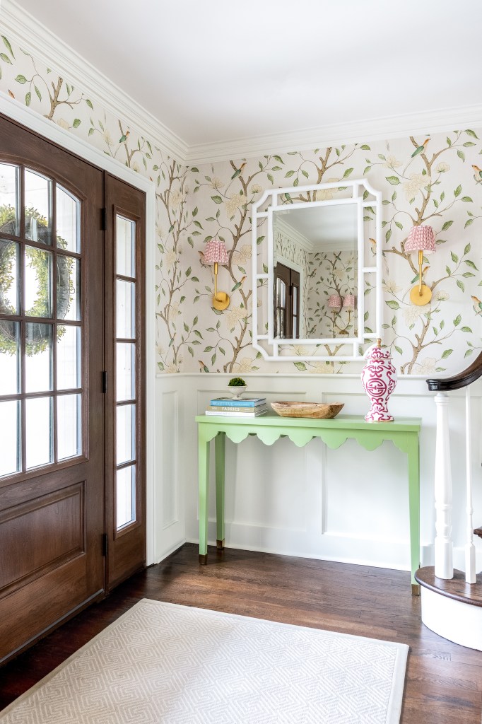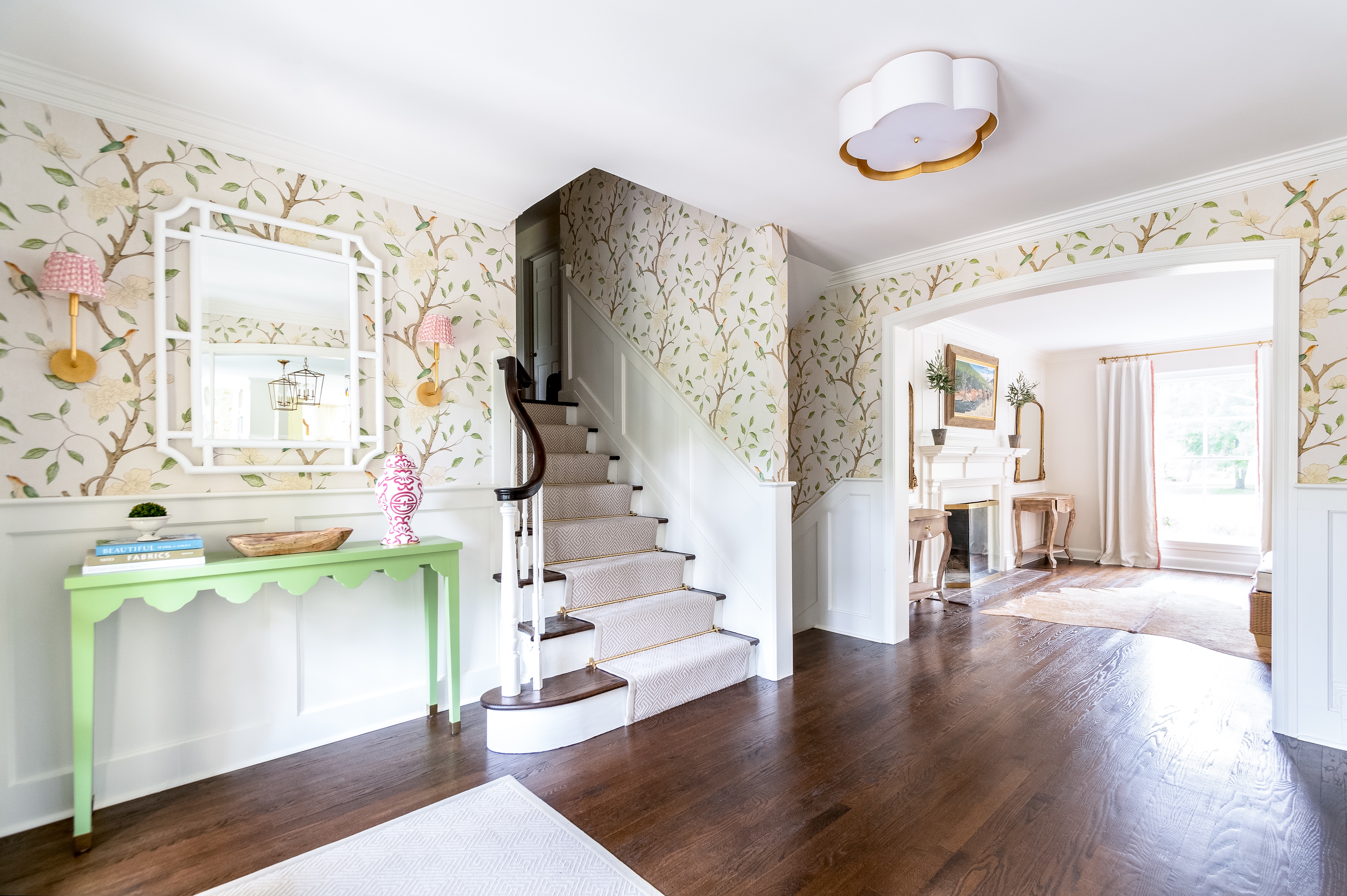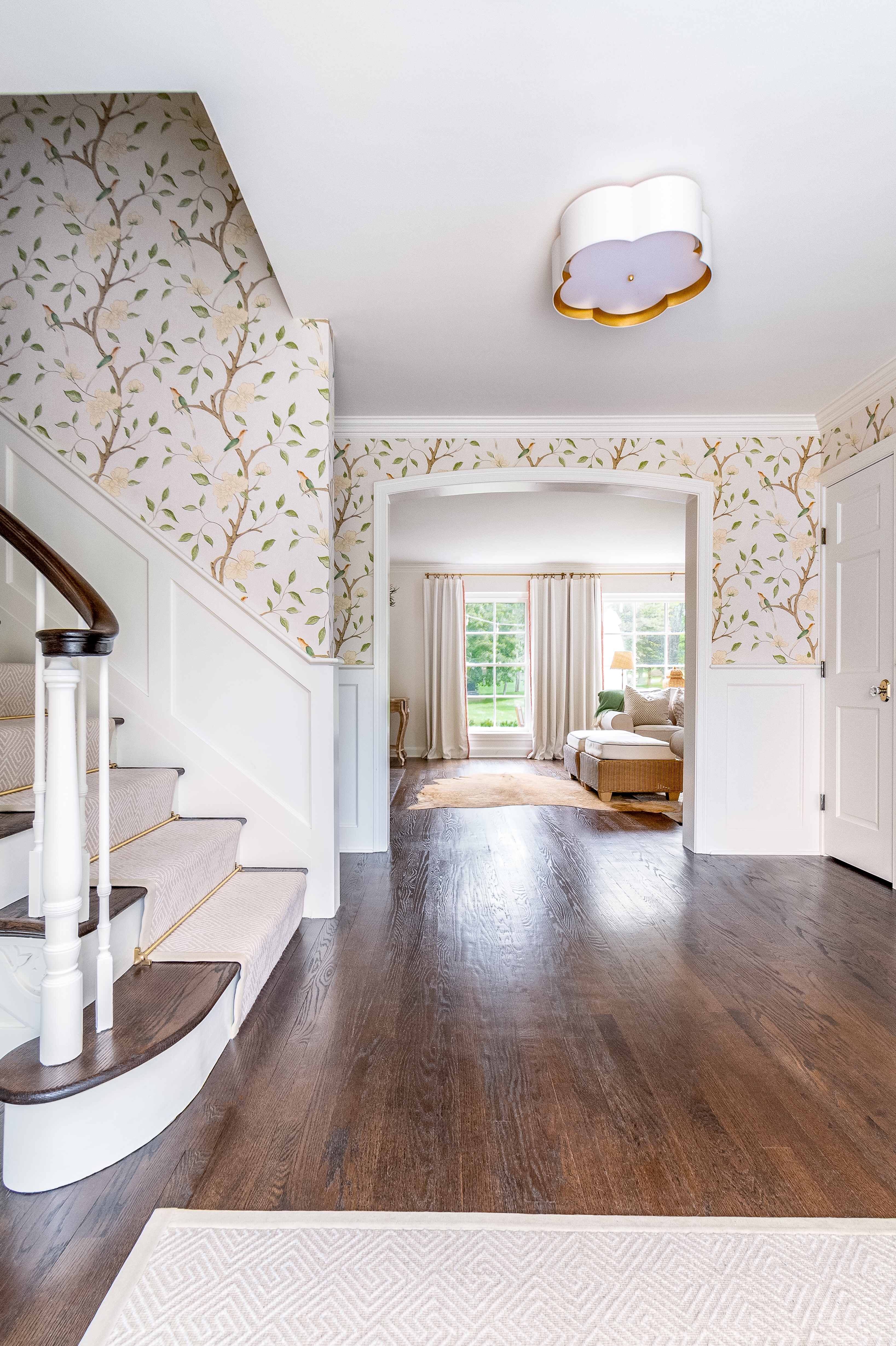 The Sanderson wallpaper was one of the generators for the design therefore, the best way to compliment it, while also dressing up the entryway, was to add wainscoting. It’s simple panels along with the addition of custom lighting completed the look of this elegant entry and created an easier flow throughout the first floor.