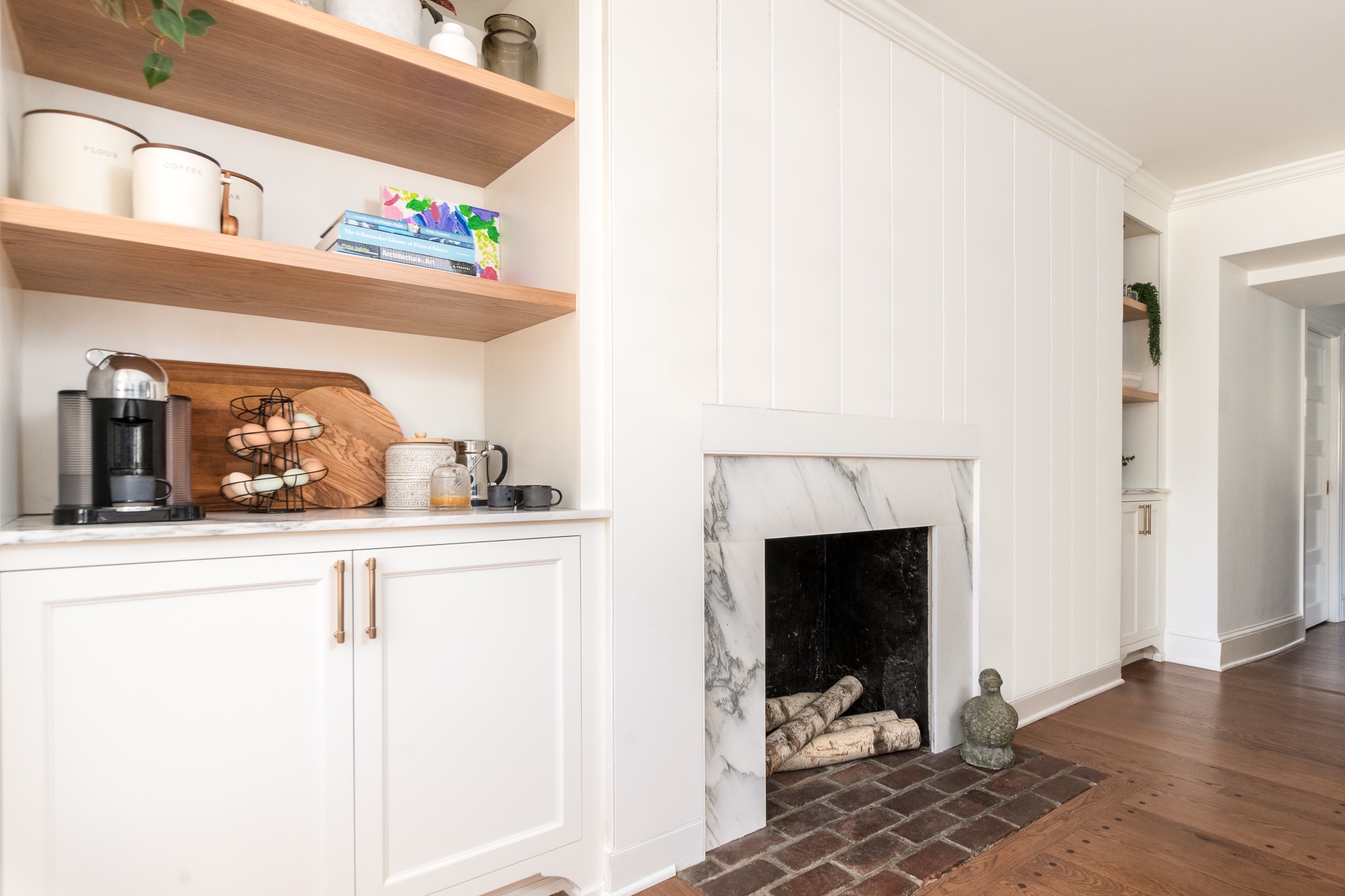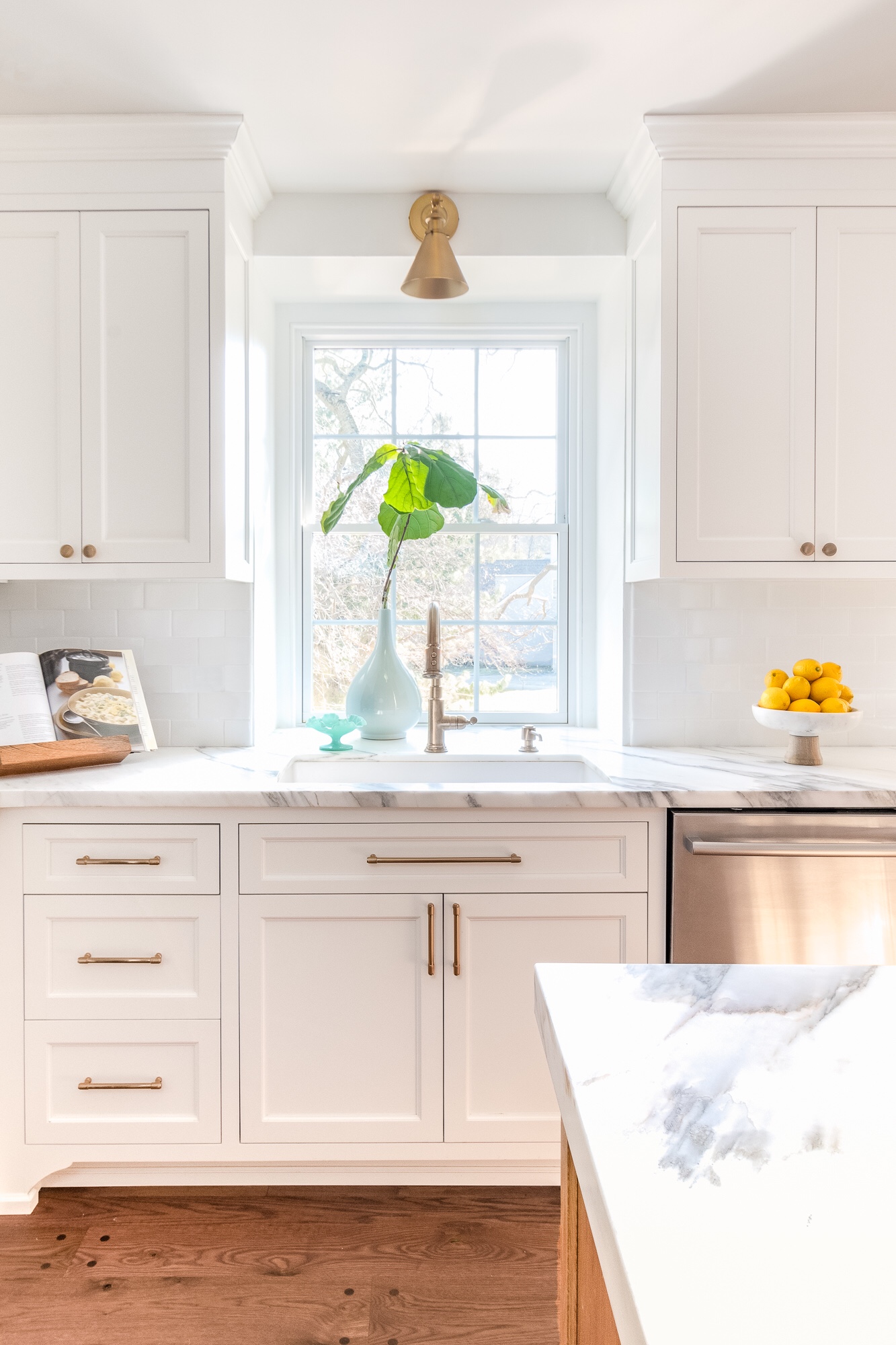 The original kitchen featured a false sill that concealed the lower portion of the window to accommodate base cabinets. We removed this obstruction, opening up the space, and extended the new marble countertops into the deep window well, creating a seamless and elegant design detail.