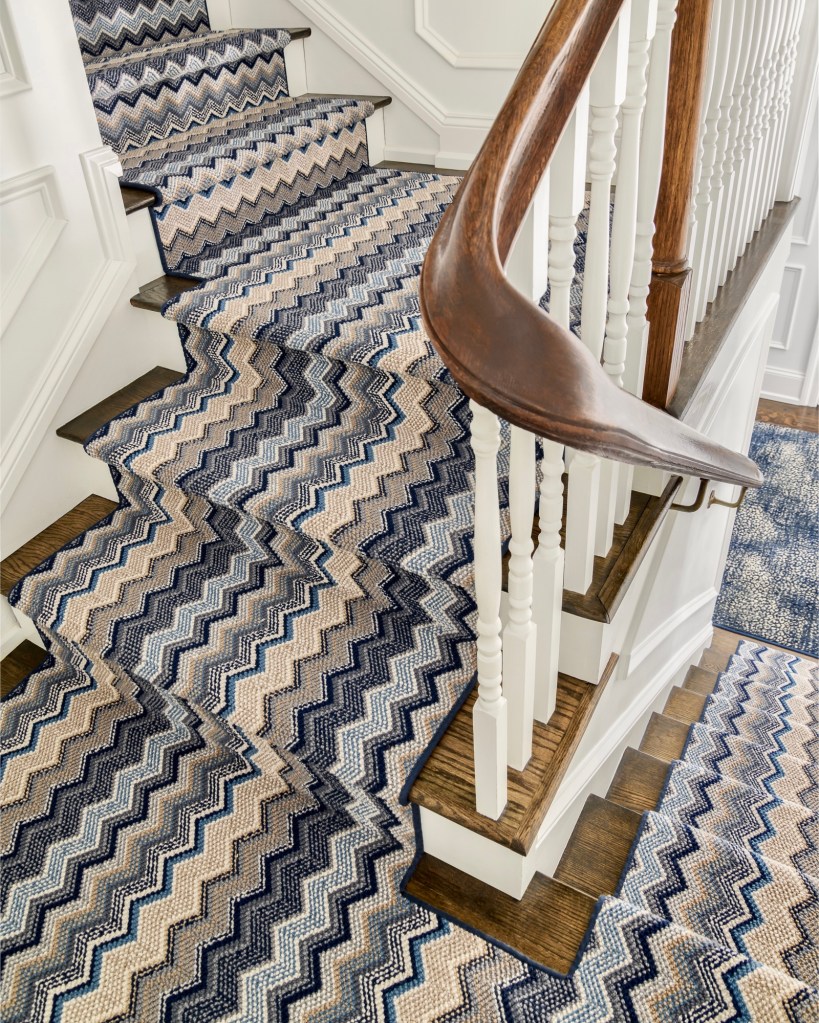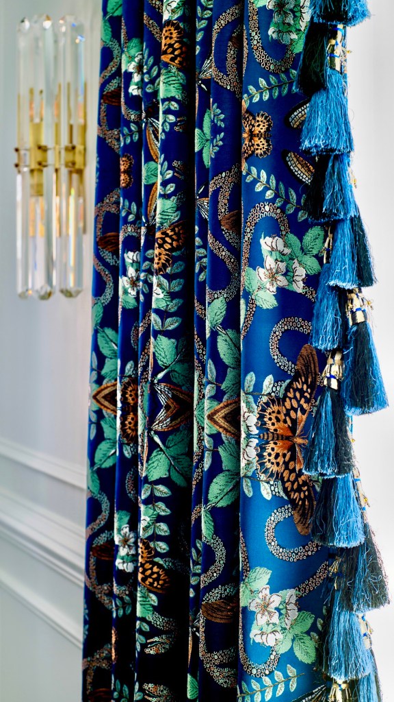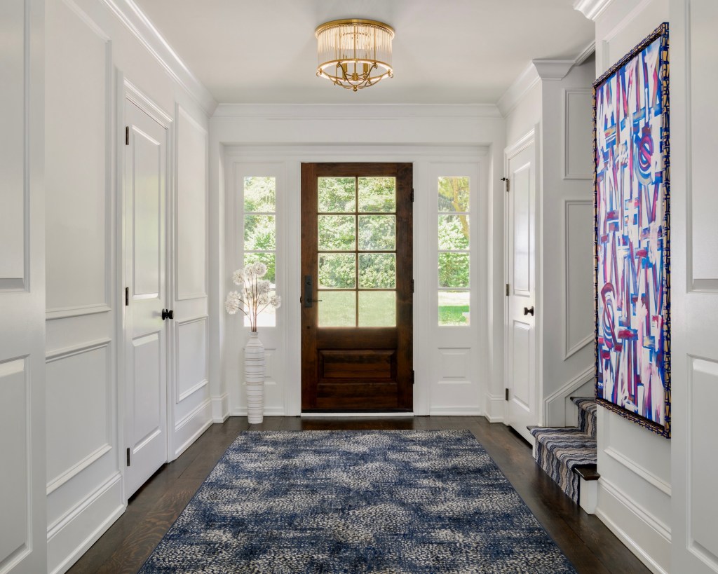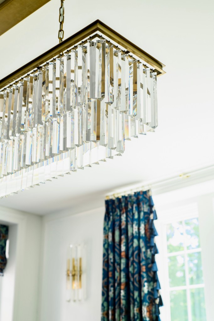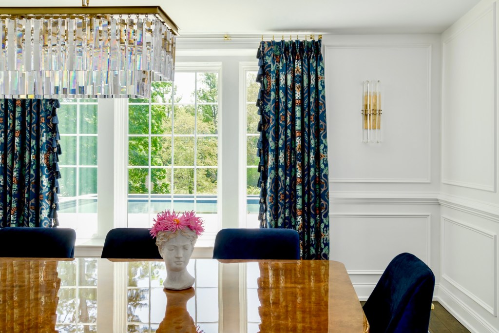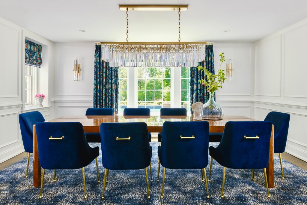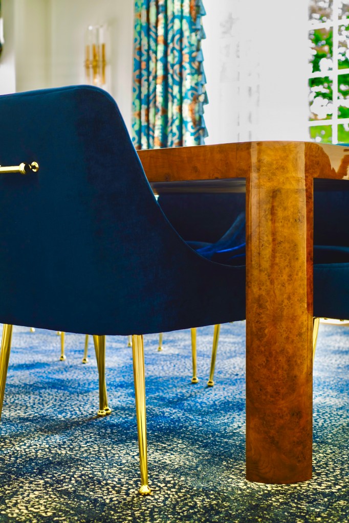 A custom painting, commissioned by artist Joseph McClozkey creates a seamless transition from Foyer into Dining Area.High gloss varnish adds light and breaks up the heaviness of the blue. Elegant and whimsy.This linear crystal chandelier adds color and a little sparkle to the room. Brass pulls add practicality and sophistication. This Missoni runner had to be custom cut along its zig zag pattern to make sure the seems weren’t visible.