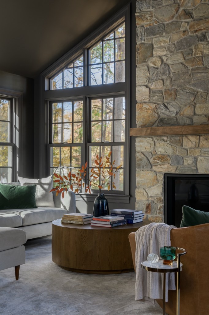 Dual seating areas are perfect for flexible living. The main area, featuring a plush sectional centered around a stone fireplace, offers a cozy setting for family gatherings. Meanwhile, a secondary seating area with two comfortable accent chairs creates an intimate space for reading, chatting, or enjoying a drink from the bar. The two areas flow together seamlessly, giving the room a sense of openness and allowing it to adapt to different activities.
