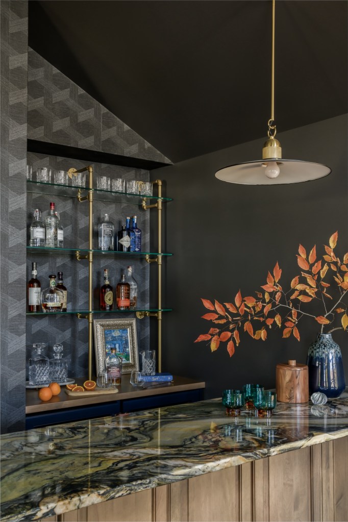 The full bar commands attention with its brass rails and sleek glass shelving, blending refinement with approachability. The quartzite countertop adds character through its distinctive patterns, while the Phillip Jeffries vinyl wallpaper provides geometric texture that beautifully complements the space. This combination creates a stylish and practical backdrop, perfect for both everyday use and entertaining.
