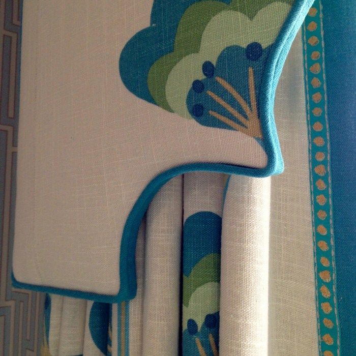 The cornice board and drapery panels were recently installed on the landing in the Rosemont Re Design project. The fabric has graphic floral print which keeps the window lite against the dense geometry of the wall paper. The trim and piping are the details that really make this window treatment special while the cornice design … Continue reading A Whimsical Window Design
